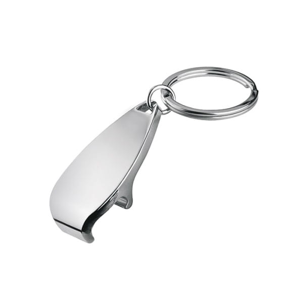 Duży owalny breloczek do kluczy ze zwężaną górą zaprojektowany w formie otwieracza do butelek. Brelok jest wyprodukowany z chromowanego metalu, dzięki czemu jest bardzo trwały oraz odporny na uszkodzenia. Będzie praktycznym gadżetem reklamowym dla wielu branż.