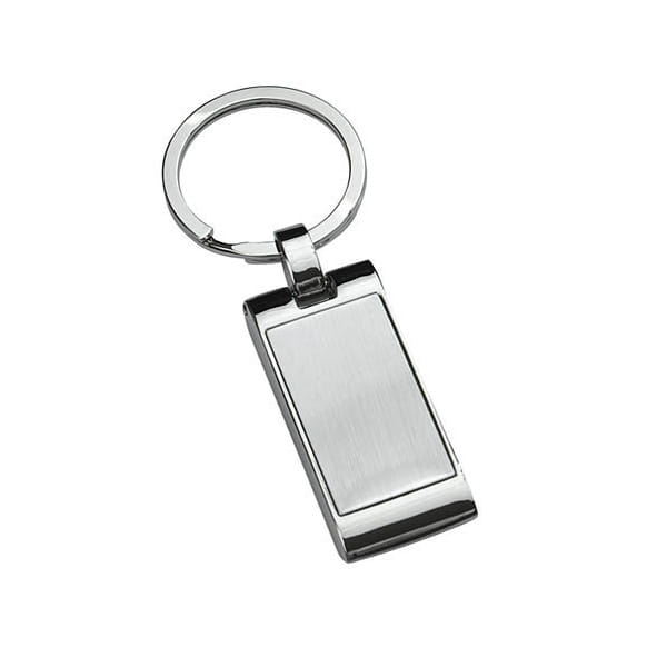 Metalowy brelok do kluczy z prostokątną, falowaną zawieszką. Brelok pakowany jest w czarny kartonik. Logo grawerujemy na powierzchni breloka.