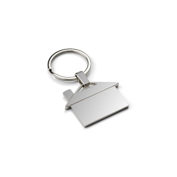 Metalowy breloczek do kluczy w kształcie domku z dachem. Wykonany z materiałów wysokiej jakości. Będzie praktycznym dodatkiem do kluczy. Logo lub inne treści reklamowe wygrawerujemy na powierzchni breloczka.