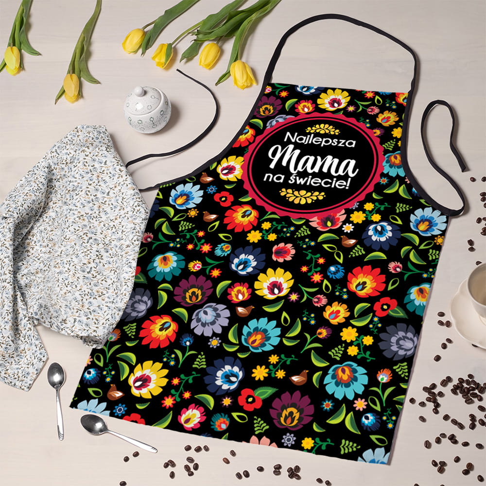 Wybierz wyjątkowy prezent na Dzień Matki, który jest praktyczny i przyda się każdej mamie – fartuch kuchenny z nadrukiem w piękny kwiatowy wzór.