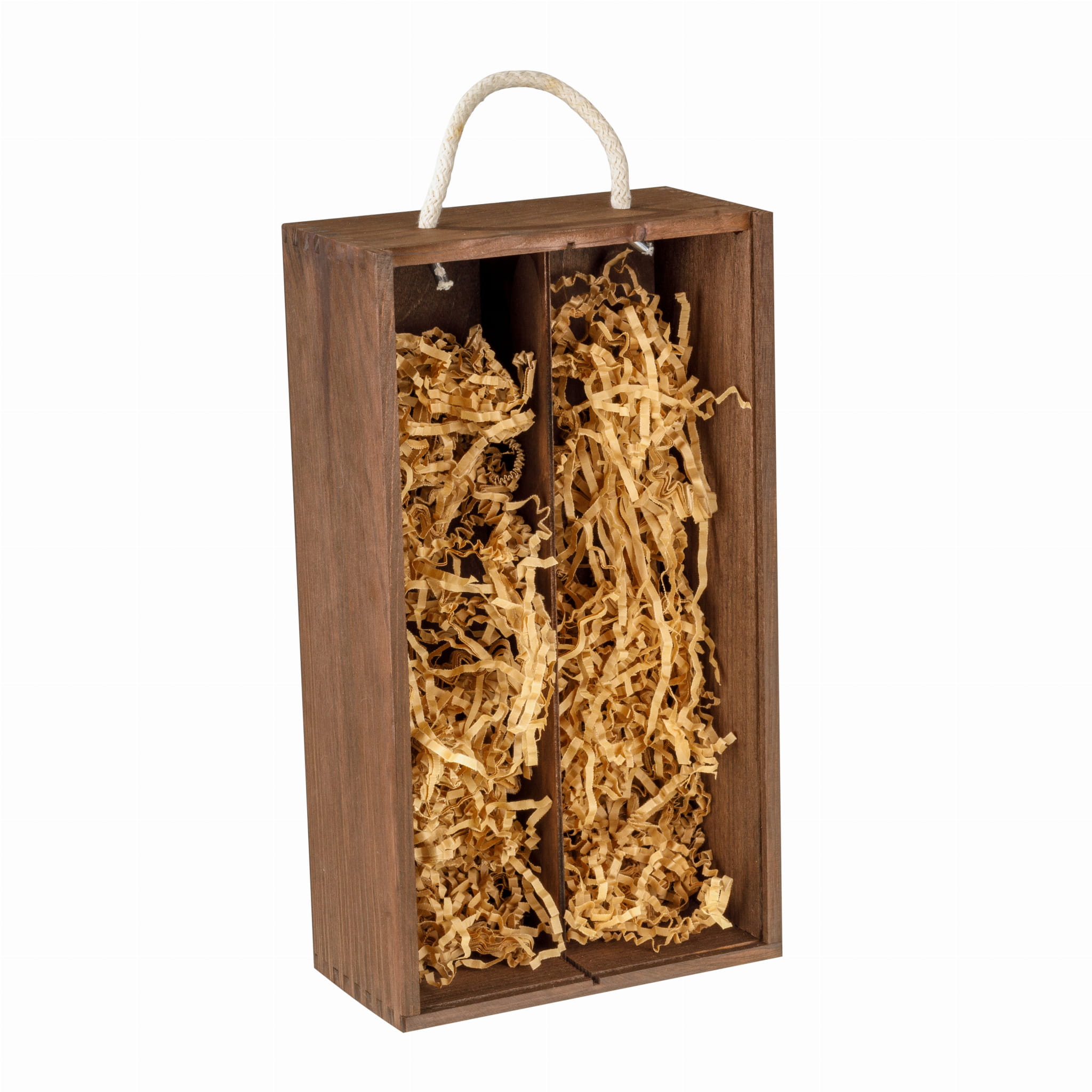 Skrzynka na alkohol wykonana jest z drewna i sklejki. Wewnątrz znajduje się przegródka, którą można wyjąć. Posiada uchwyt ze sznurka jutowego oraz wypełnienie z wiórków papierowych.