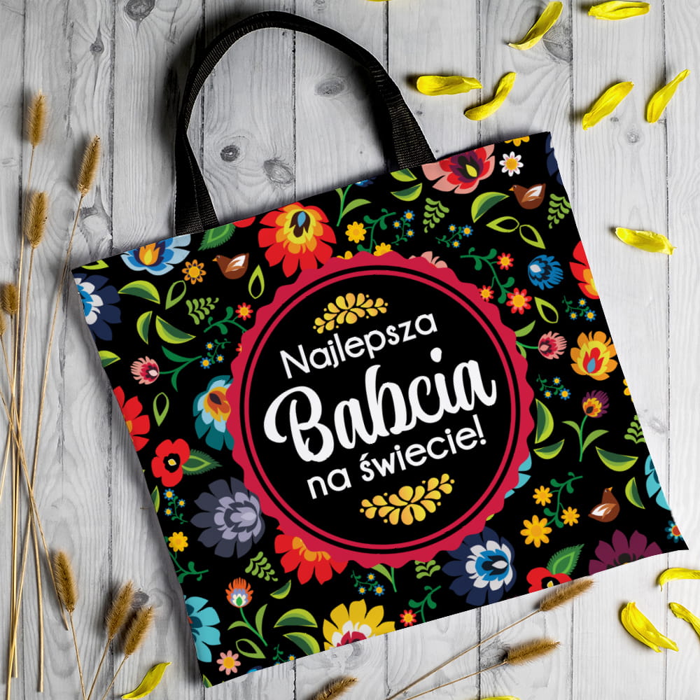 Znudziły Ci się już standardowe prezenty na Dzień Babci? Postaw więc na praktyczną torbę na zakupy Najlepsza babcia na Świecie w Folkowy wzór.
