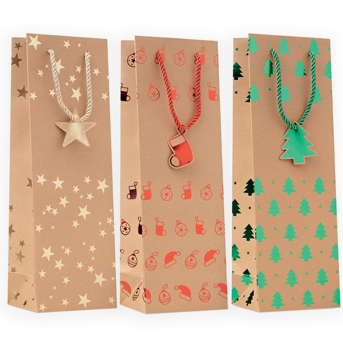 Elegancka torba papierowa kraft na prezenty z sezonowym wzorem. Dołączona zawieszka. 250 gr/m². Ta stylowa, papierowa torba świąteczna to idealne opakowanie na prezent dla miłośnika wina. Pięknie zapakowany prezent sprawi wiele radości!