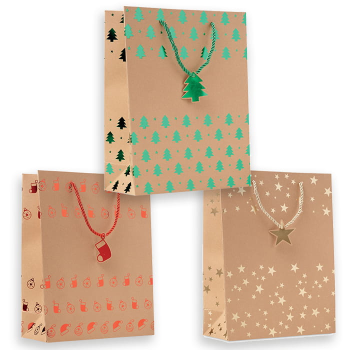 Elegancka torba papierowa z papieru kraft na prezent z sezonowym wzorem. Dołączona zawieszka. 250 gr/m². Ta stylowa, papierowa torba świąteczna to idealne opakowanie na prezent dla kogoś wyjątkowego.